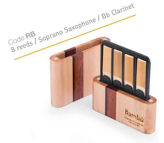 Porte-anches de haute qualité pouvant contenir 8 anches de clarinette en Sib ou de saxophone soprano. Couleur brun clair-jaune, intérieur synthétique, extérieur bois. 100% fait main, le bois et la couleur peuvent donc varier.